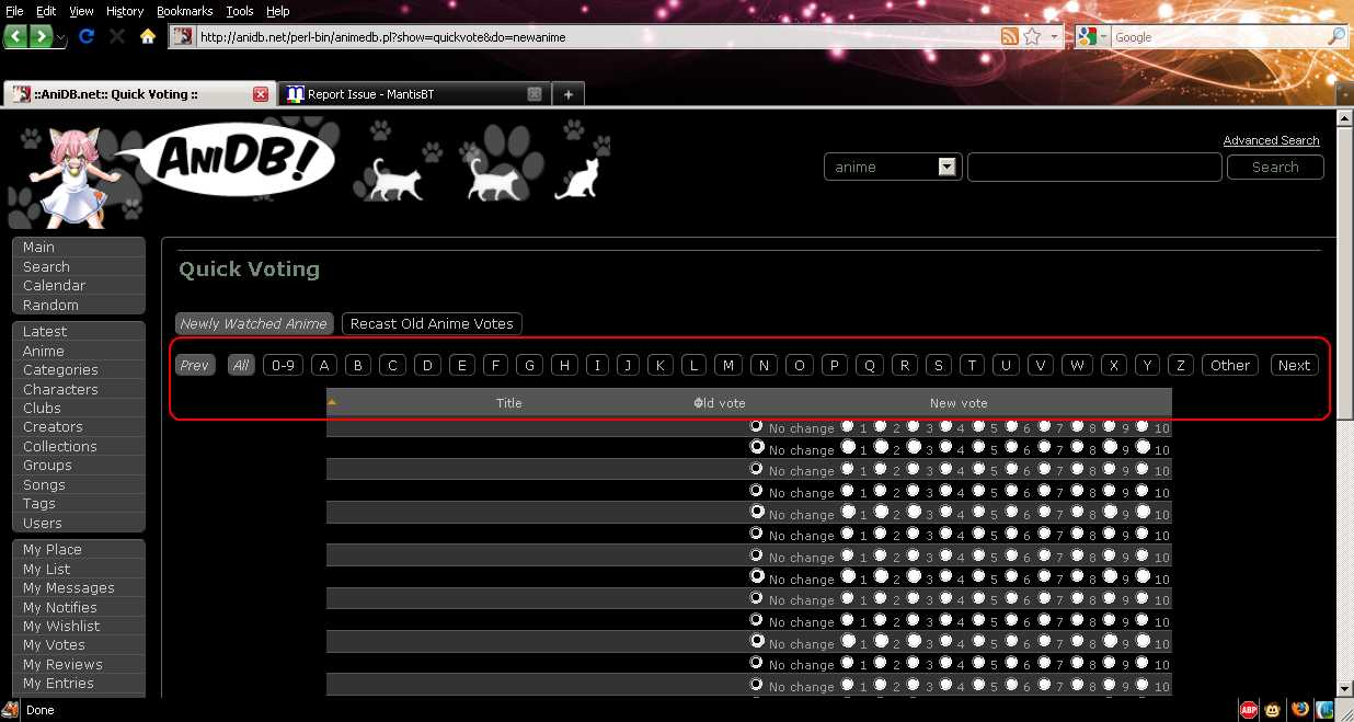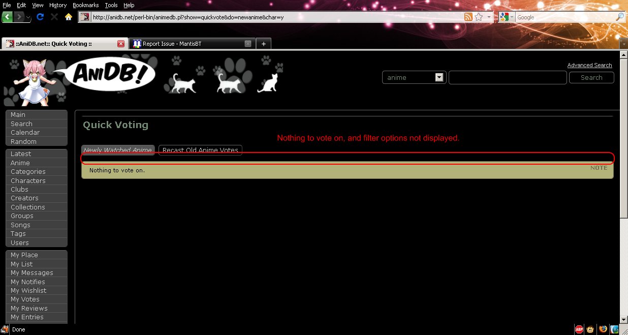 | Steps To Reproduce | Load http://anidb.net/perl-bin/animedb.pl?show=quickvote and then apply a filter to a category that you do not have anything left to vote on. | ||||