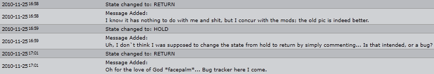 Additional InformationI think the system doesn't like having to swallow the comment of someone who is neither the creq issuer nor a mod. I can even suggest a possible way for the system to check whether it should change the state: