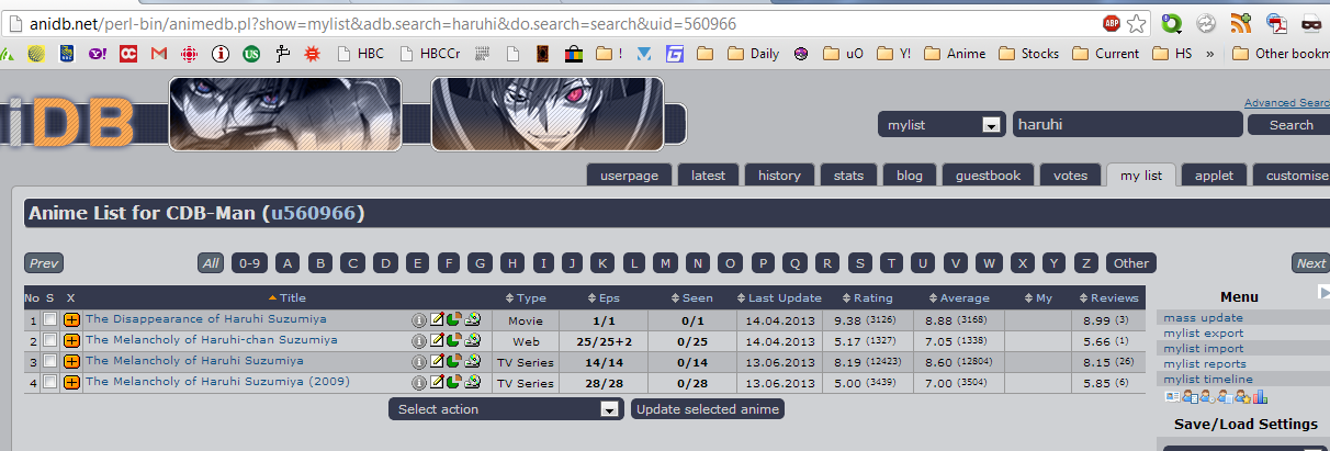 Similar issue happens with Haruhi series. Although, Haruhi doesn't seem to have the myList episode count problem (screenshot #2 attached). It only has the !next and !ml on IRC problem of not showing the in myList count correctly, and !next complaining of missing files. [01:55:26] CDB-Man: !next 6367 [01:55:27] @Chii[AR]: (cdb-man) NEXT: Suzumiya Haruhi no Yuuutsu (2009) (6367) - 28 eps: Episode 1 (102633) (not in mylist, next present: 8) http://anidb.net/e102633 [01:56:39] CDB-Man: !next 3651 [01:56:39] @Chii[AR]: (cdb-man) NEXT: Suzumiya Haruhi no Yuuutsu (3651) - 14 eps: Episode 1 (102633) http://anidb.net/e102633 [01:56:42] CDB-Man: !ml 3651 [01:56:42] @Chii[AR]: (cdb-man) MYLIST: Suzumiya Haruhi no Yuuutsu (3651) - 14 eps: in mylist: 1-14 25-28 watched: none external storage (cd/dvd/...): 1-14 25-28 groups: (De.us) 1-14 25-28 [01:56:47] CDB-Man: !ml 6367 [01:56:48] @Chii[AR]: (cdb-man) MYLIST: Suzumiya Haruhi no Yuuutsu (2009) (6367) - 28 eps: in mylist: 8 12-24 watched: none external storage (cd/dvd/...): 8 12-24 groups: (De.us) 8 12-24 |