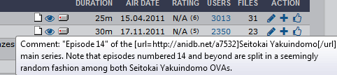 o_O What happened to the images? They seem to be missing in more issues. Anyway... At a first glance, it appears to be working in devint. Do note the devint ep note is rather outdated and less link-y, so you may want to update it to the current one from main for testing purposes. I'm attaching a new pic just in case, though I'm not sure there's a point; it was taken hovering over the ep note for ep 1 at https://anidb.net/a8204, though it can rather easily be reproduced across the Seitokai Yakuindomo OVAs/OADs. |