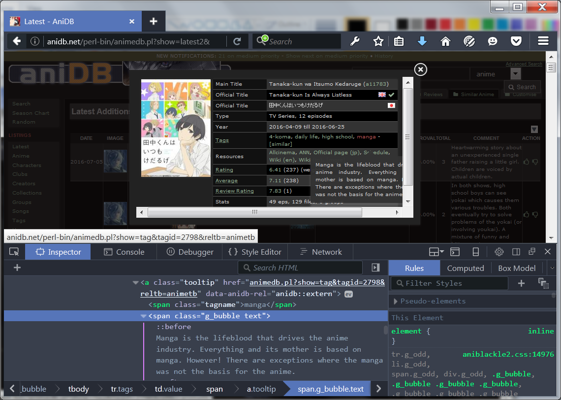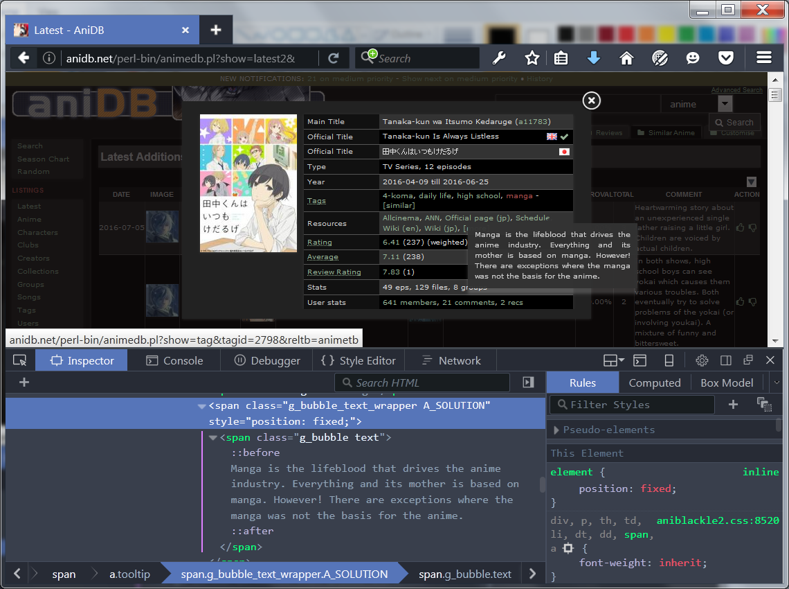 | Steps To Reproduce | 1. Find an anime with a number of infobox tags. 2. Click "i" for ajax info on an anime from any listing with the feature, e.g. the anime, mylist, latest2. 3. Hover over a tag near the right side of the infobox to witness the tooltip get cut off (and, in some browsers, scrollbars appear) | ||||