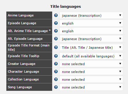 | Description | My language settings in screenshot #1. When viewing https://anidb.net/a10779 I see screenshot #2. Based on my language settings, it should show: > EN_song_title_link (Jp trans_title / JP title) Or when there's no EN title for the song as is the case with Angel Fly https://anidb.net/s85107 since I have Jp trans as the alt ep title: > JP_trans_song_title_link (Jp trans_title / JP title) I'm only seeing the 1 title as in screen #2; is it messing up since all the titles are the same? | ||||