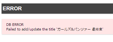 | Description | Tried to add ガールズ&パンツァー 最終章 but got the error in the screenshot, so I dropped the JP title and added without. >> DB ERROR >> Failed to add/update the title 'ガールズ&パンツァー 最終章' Went to the add/edit titles page to add the JP name, and it's only at that point that I found a more descriptive error message: >> ERROR: 9 - that title is already added to a different anime (aid:12361) as official Long story short, on show=addanime if there is an error generated, it should be more descriptive. In this case, instead of throwing generic error on adding the JP title, it should give the ERROR 9 already in DB message. | ||||