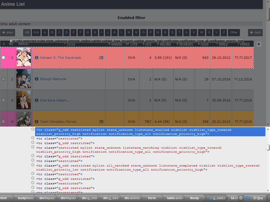 | Additional Information | There's an attached pic below: see how entries that are in My List, have classes such as "wishlist wishlist_type_towatch wishlist_priority_high notification notification_type_all notification_priority_high", and other entries (that are also in my wishlist, but not in My List), have nothing - no wishlist classes, no priority classes |