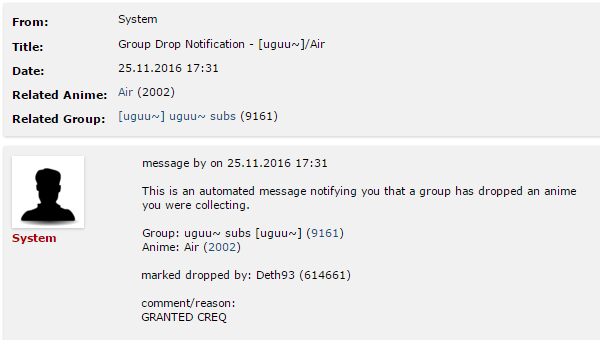 | Description | See screenshot for context ---- 1) in the top header, include: Related Animegroup: [url=http://anidb.net/ag54447]Air - uguu~ subs [uguu~][/url] (54447) 2) In the header, change the anime and group links to use the short links 3) In the header change: [uguu~] uguu~ subs to uguu~ subs [uguu~] To match most other places in the DB (including in the group drop message itself) 4) Add the animegroup in the message (the ID #s are hotlinks using shortlinks): Group: uguu~ subs [uguu~] (9161) Anime: Air (2002) Animegroup: Air - uguu~ subs [uguu~] (54447) 5) Change: GRANTED CREQ to GRANTED CREQ (c1111111) --- with hotlink to creq shotlink | ||||