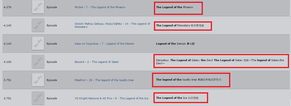 | Description | https://devint.anidb.net/perl-bin/animedb.pl?show=search&do=fulltext https://devint.anidb.net/perl-bin/animedb.pl?show=search&do=fulltext&adb.search=%22crest+of+the+stars%22&entity.animetb=1&entity.chartb=1&entity.clubtb=1&entity.collectiontb=1&entity.creatortb=1&entity.eptb=1&entity.grouptb=1&entity.songtb=1&entity.tagdatatb=1&field.titles=1&h=0&do.fsearch=Search Search term: > "crest of the stars" See attachment #1 Text highlighted as matching in aid = 6: > Crest of the > Crest of the > of Stars > of the Stars None of which actually match the searched quote. Search match is properly highlighted for the other results. ================ https://devint.anidb.net/perl-bin/animedb.pl?show=search&do=fulltext&adb.search=%22legend+of+the%22&entity.animetb=1&entity.chartb=1&entity.clubtb=1&entity.collectiontb=1&entity.creatortb=1&entity.eptb=1&entity.grouptb=1&entity.songtb=1&entity.tagdatatb=1&field.titles=1&h=0&do.fsearch=Search Search term: > "legend of the" See attachment #2 Text highlighted as matching for various hits: > The Legend of the > The Legend of > the > Legend of None of which actually match the searched quote. Search match is properly highlighted for some of the other results. | ||||