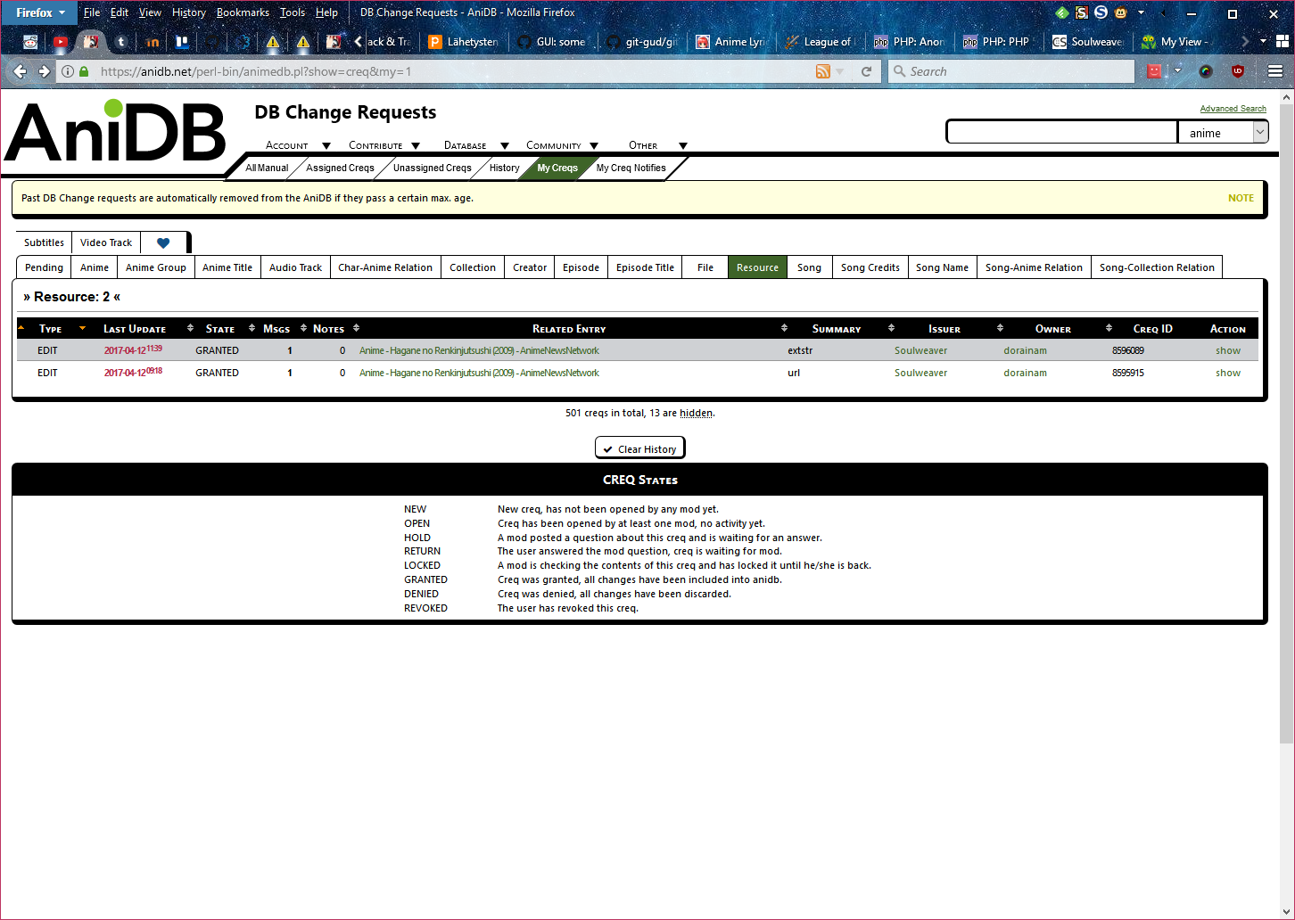 | Description | The type displayed in the "related entry" column for resource creqs in creq listing views doesn't match the actual type of the resource in at least some cases. See attached screenshot; both creqs state the creq is for ANN, but in reality https://anidb.net/c8596089 is an English Wikipedia resource and https://anidb.net/c8595915 is an Official Site resource. | ||||
