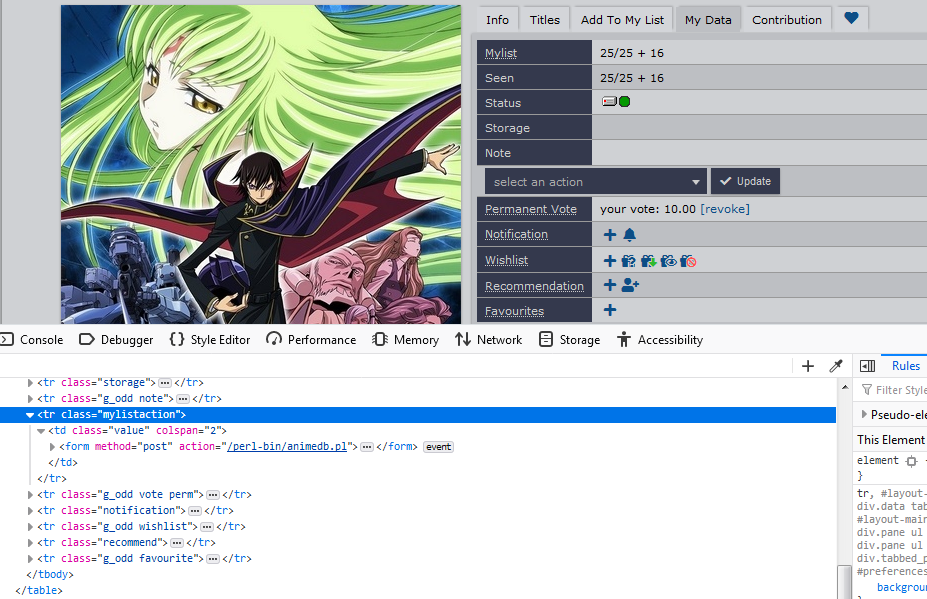 | Summary | 0003367: Missing <th> on Anime page > My data > Mylist actions | ||||