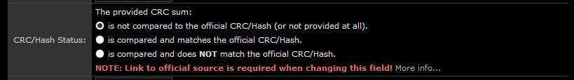The note in the massadd form is not a requirement as such and more a technical guideline. As we try to minimize manual insertion of data for files inserting the crc by hand for each entry would be a waste of time. At the same time we require the crc field for be filled when the hash status is set. Hence you can't set the status without having the crc filled. Which you can only do in the mass add form if you have them as a filename tag. I hope you see the issue. Most releases feature properly named files and hence this isn't a large issue and for instances where md5 files are provided a mod can easily mass set the files in quesiton to verified if he gets contacted. |