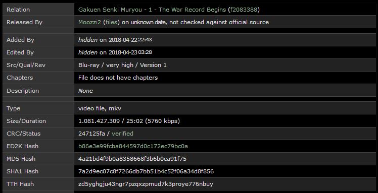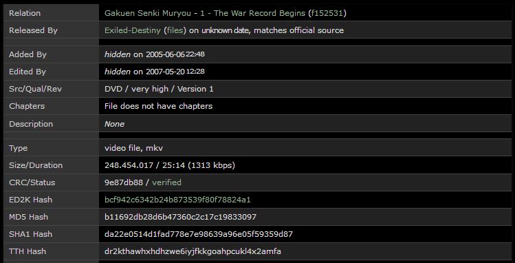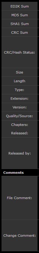 On the File metadata page: - "CRC/Hash Status" is not immediately apparent as it is appended to "Released By". - possible confusion with "CRC/Status" field which is "verified" by API client (e.g. Avdump2). |