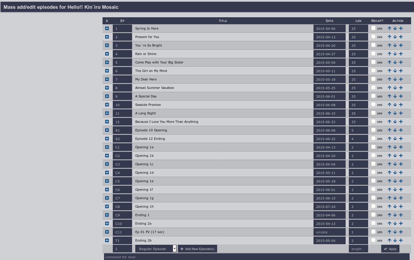 Well yeah, but I don't want that trailer to become a C episode either, which current interface suggests. If I were to give a more realistic example: I want to add a new S episode before all existing S episodes. So I add it (a new row S3 titled "Episode S3" appears at the end) and move it up - it's now in the row S1, which is nice, but "Episode 12 Ending", which was S2 and is supposed to become S3, is now in the row C1 (and the PV is in the row S3). I'm personally afraid to save changes in this state, as I can't be sure whether the type of all episodes is correctly retained. If this is the intended behavior and I can safely use the feature, I don't mind making this issue a lower priority suggestion instead of a bug and removing "broken" from the summary, but I still think the interface is misleading. Also I really think the interface used to behave differently right after implementing 0003128 as I used it a few times, but I might be wrong. |