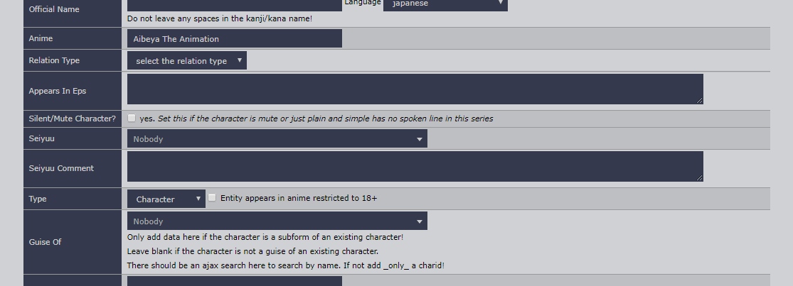 | Description | When adding a character, "Silent/Mute Character?" is placed between "Relation Type" and "Appears In Eps" Or alternatively, you could also say that "Appears In Eps" is placed between "Silent/Mute Character?" and "Seiyuu" I think that "Appears In Eps" should come right next to "Relation Type", and "Silent/Mute Character?" should be placed before "Seiyuu" (see the last attachment, that is an edited screenshot, for an illustration) or after "Seiyuu Comment" field | ||||