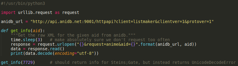 | Steps To Reproduce | Execute the following python script (fingers crossed that github-style markdown works here): ```python #!/usr/bin/python3 import urllib.request as request anidb_url = "http://api.anidb.net:9001/httpapi?client=listmaker&clientver=1&protover=1" def get_info(aid): """Get the raw XML for the given aid from anidb.""" time.sleep(3) # make absolutely sure we don't request too often response = request.urlopen("{}&request=anime&aid={}".format(anidb_url, aid)) data = response.read() print(data.decode(encoding="utf-8")) get_info(7729) # should print info for Steins;Gate, but instead raises UnicodeDecodeError ``` | ||||