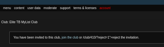 | Steps To Reproduce | 1. Get invited to a club 2. Go to that club's page (e.g. https://anidb.net/club/410) | ||||