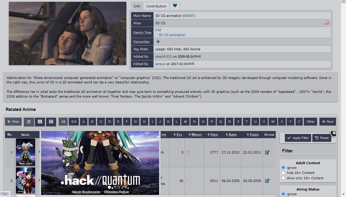 | Additional Information | This css rule fixes the issue: #layout-main div.tag_all .g_bubblewrap, #layout-main div.tag_all table.animelist, #layout-main div.tag_all table.characterlist { overflow-x: initial; } It also happens to fix another issue you may see in the attachment below – the "x" button at the top right corner of the filters being cut | ||||