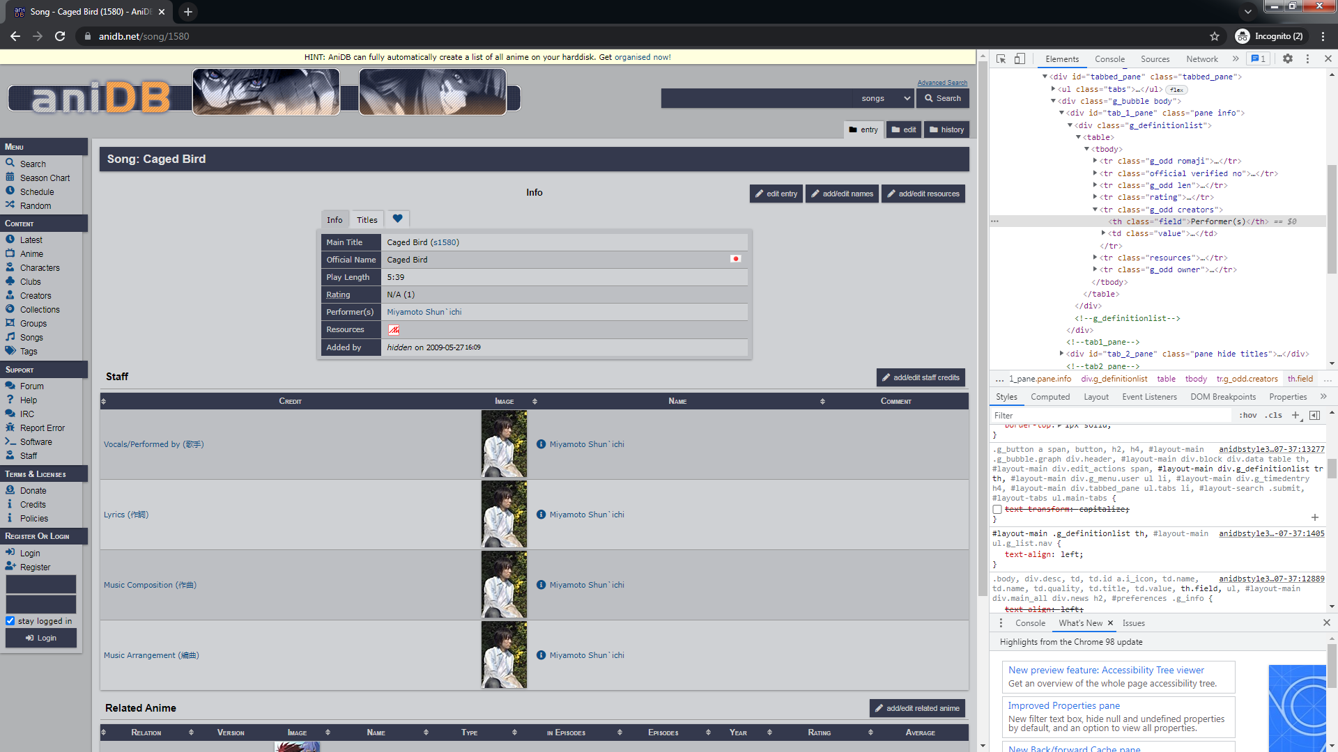 | Steps To Reproduce | Simply open a song page (e.g. https://anidb.net/song/1580) while not logged in, for example using an InPrivate/Incognito browser screen. | ||||