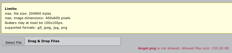 | Description | https://anidb.net/upload shows a max file size limit of 204800 bytes. However, trying to upload a 182753 byte image fails with the error message "Allowed Max size: 150.00 KB".