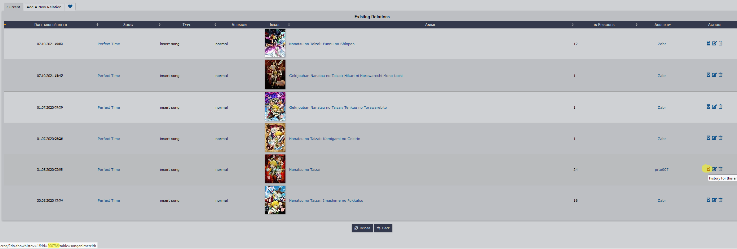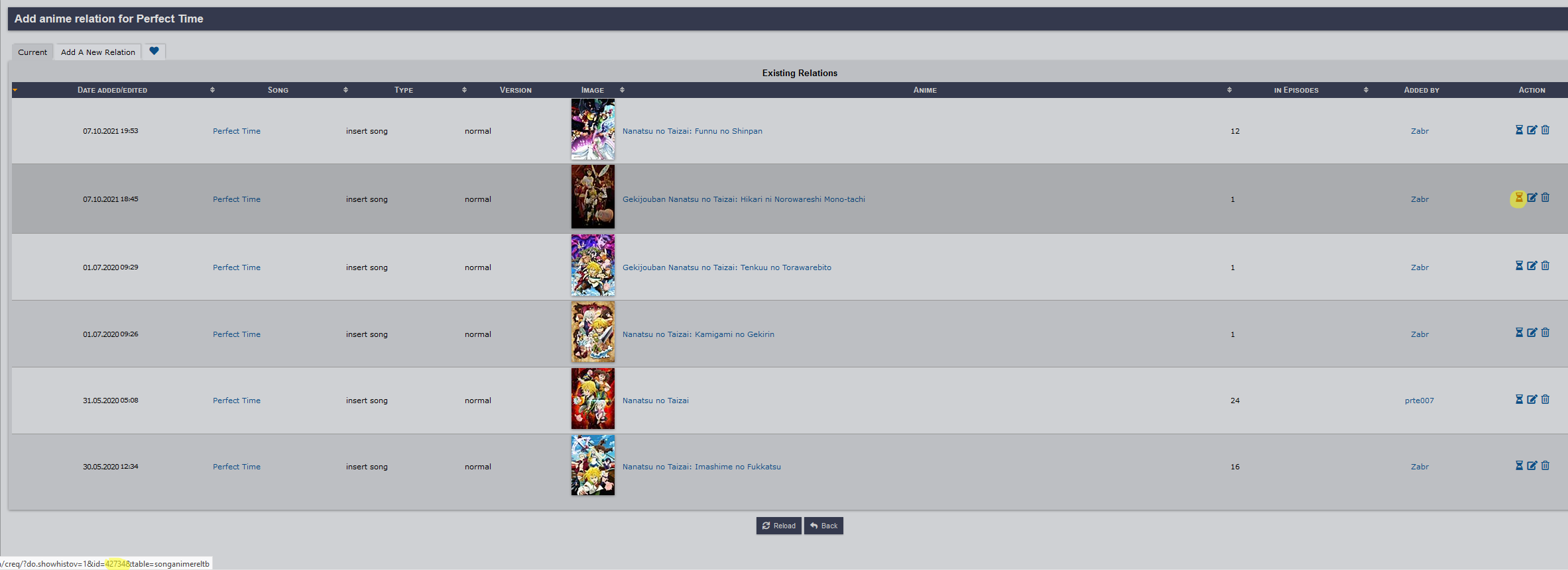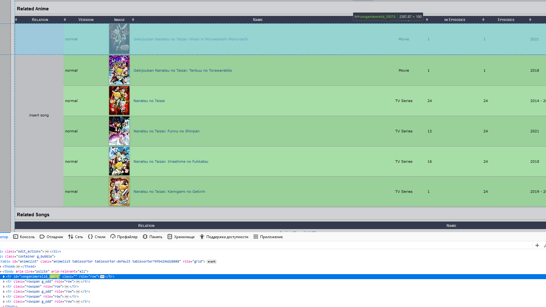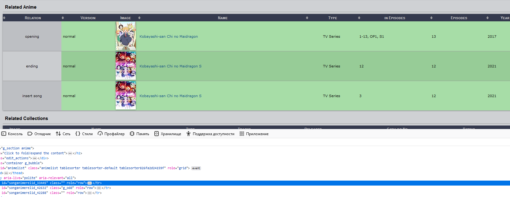 | Description | For now, on song pages in "table#animelist" there are "id" attribute only at 1st "tr" of each relation group (opening/ending/etc). It works correct with only 1 relation in 1 group (see "correct"). But, if there are more than 1 relation in 1 group, "tr" can has id attribute with wrong id (see "incorrect" 1-3), as I understand, the 1st "tr" will always has id of the earliest anime-song relation It will be great, if every relation (tr) will have it's own correct relation id in "id" attribute | ||||