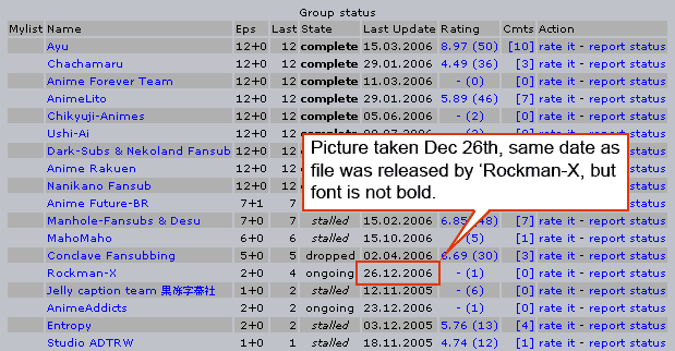 | Description | The 'Last Update' date in the Group Stats table on anime pages is no displayed in bold font when a file has been added the same day the user visits the anime page (or was it since the last visit? Can't remember.) | ||||