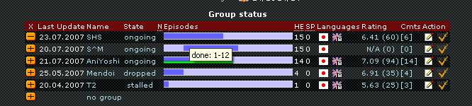| Description | I've noticed more then once that the bar showing episodes that have been done is not always up to date... Personally, I noticed it for Kaze no Stigma, cause right now is says says SHS did 1-12 but their HE is 15... Yesterday I noticed that the graphic did not change at all when i added a new ep to my mylist. | ||||