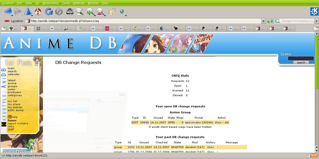 | Description | When viewing the list of my creqs, the one that is currently open appears messed up. The creq is concerning the anime with id 4121, but the ID field links to http://anidb.net/perl-bin/4121 (which is a 404, of course). Moreover, the link-text says "29698", which is neither the creq-id (it's 861944) nor, as far as I can tell, any other related ID-number. See attached screenshot. | ||||